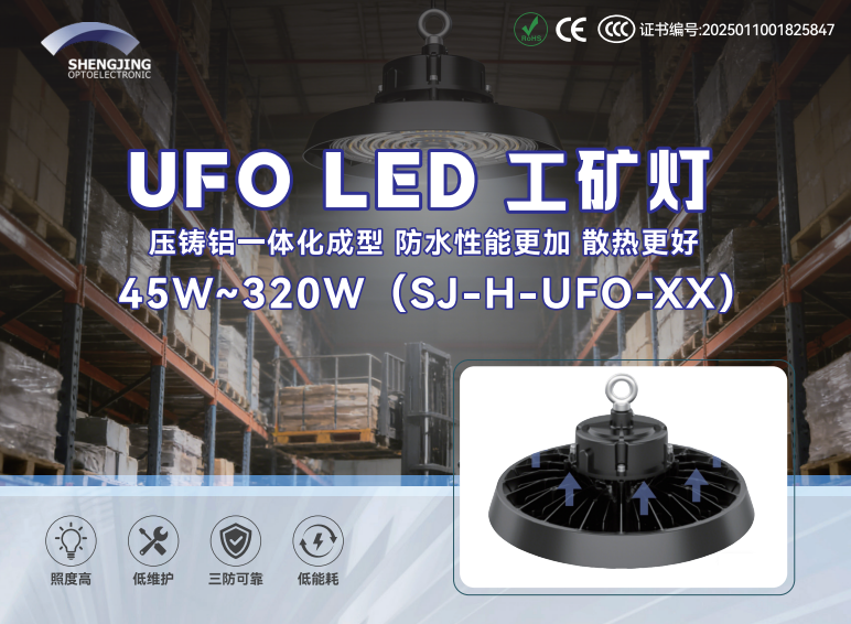 • UFO LED 工礦燈(SJ-H-UFO-XX):壓鑄鋁一體化成型,防水、散熱性能更優,功率覆蓋 45W~320W,適配倉儲、工業廠房等大空間場景;